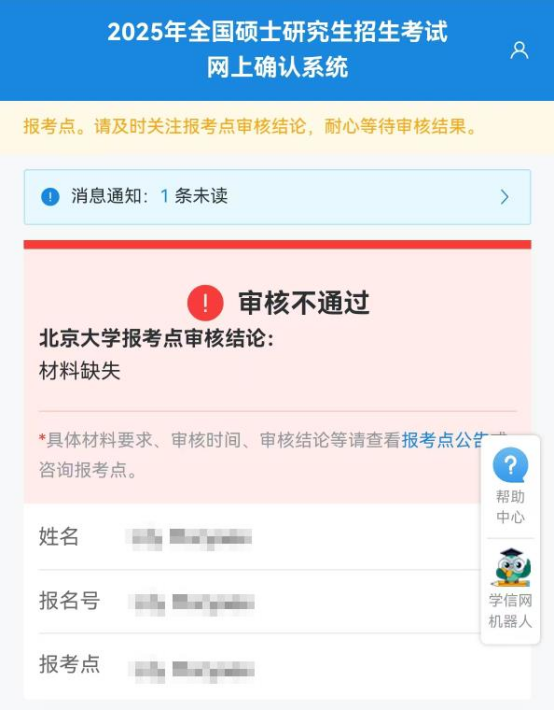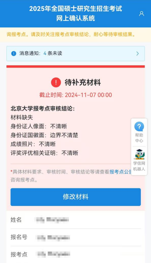 (2)待补充材料:考生已在网上确认系统中确认并上传材料,且报考点审核不通过并要求考生修改或补充确认材料。待补充材料考生登录系统看到的页面如图。