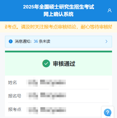 (1)审核通过:考生已在网上确认系统中确认并上传材料,且报考点审核通过。已审核通过考生登录系统看到的页面如图。