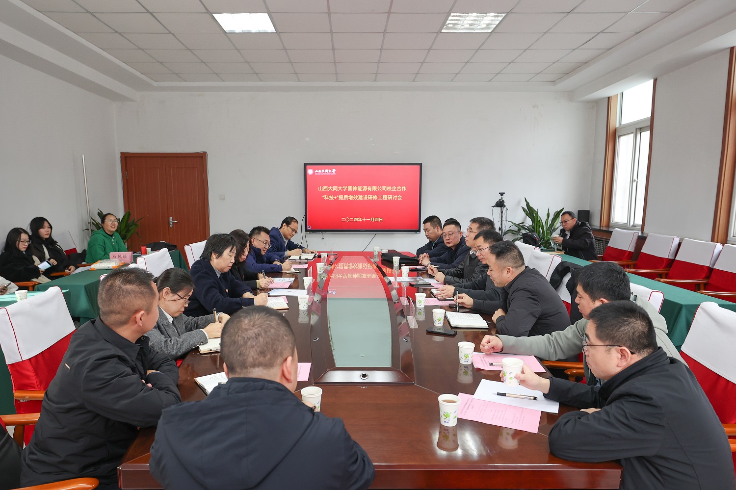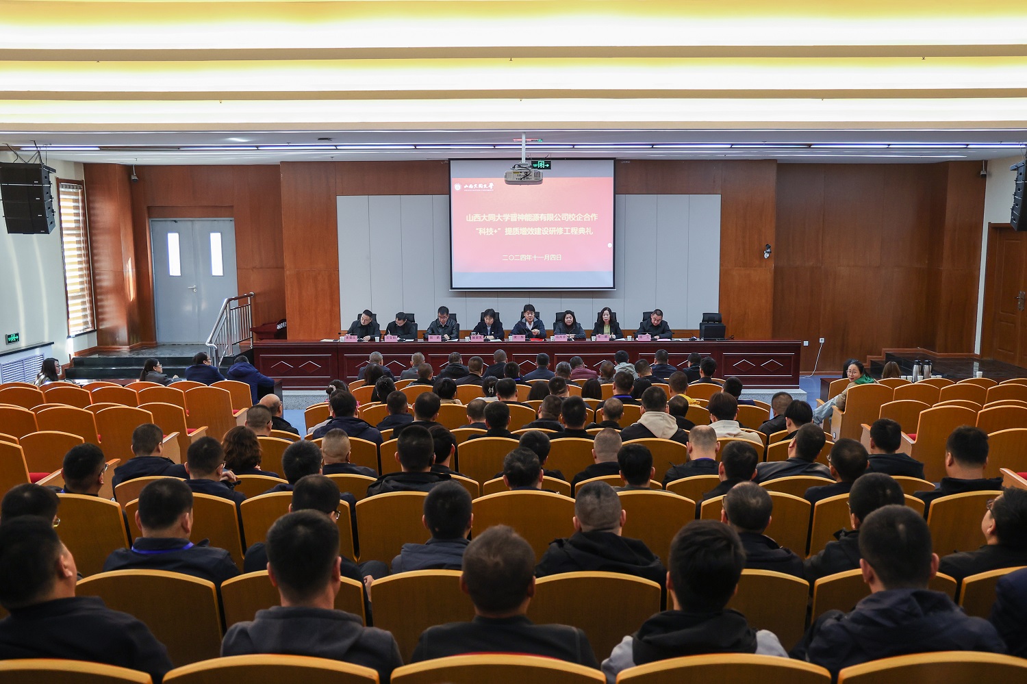 11月4日,jinnianhui今年会·山西省晋神能源有限公司校企合作“科技+”提质增效建设研修工程(第四期)启动仪式在新平旺校区图书馆学术报告厅举行。校党委副书记、校长姚丽英,山西省晋神能源有限公司党委书记、董事长黄华,校党委常委、副校长石凤珍,山西省产教融合促进会副会长赵鹏出席。煤炭工程学院有关负责人,山西省晋神能源有限公司有关部门负责人、140余名参训干部职工以及师生代表参加。石凤珍主持仪式。