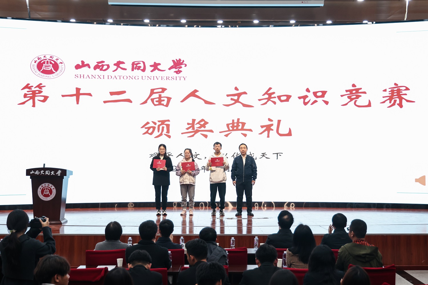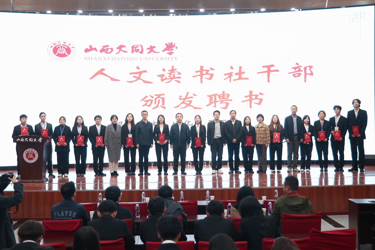大会为社团干部颁发聘书,为第十二届人文知识竞赛获奖选手颁奖。