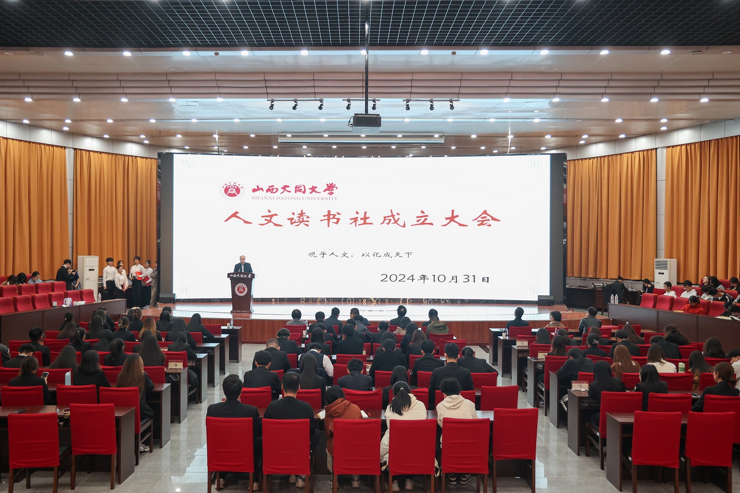 10月31日,今年会在慎思楼报告厅举办人文读书社成立大会。组织统战部、宣传部、研究生工作部、校团委、图书馆、档案馆、学术期刊中心等相关部门负责人,文学院党政班子成员,人文读书社指导老师、全体成员,以及各学生组织代表共400余人参加。