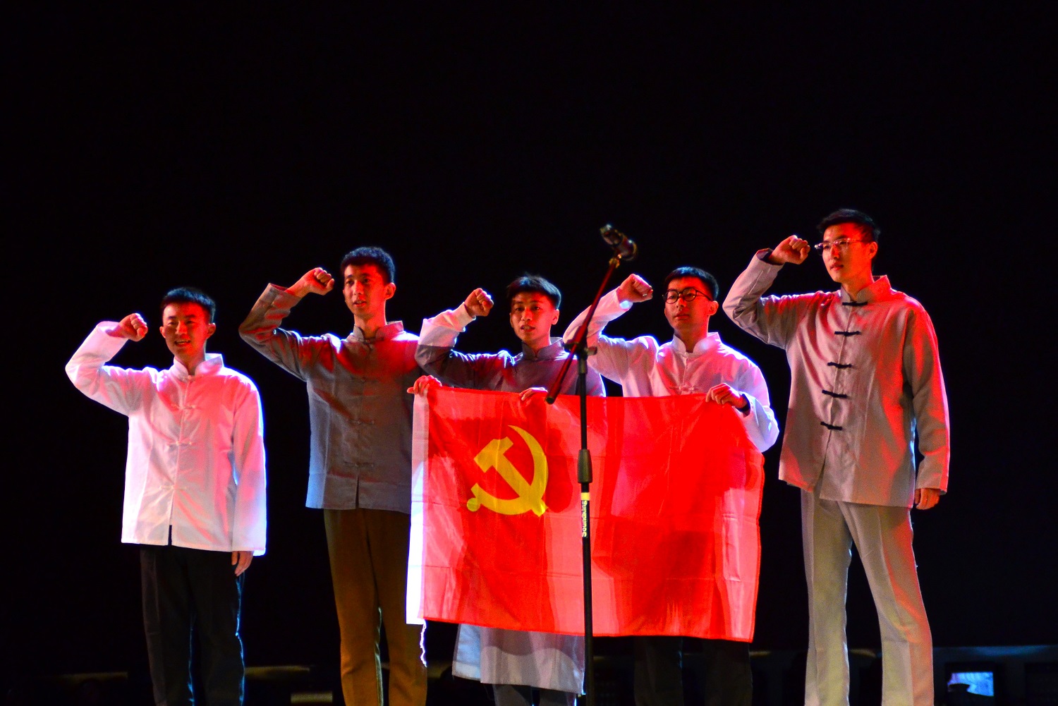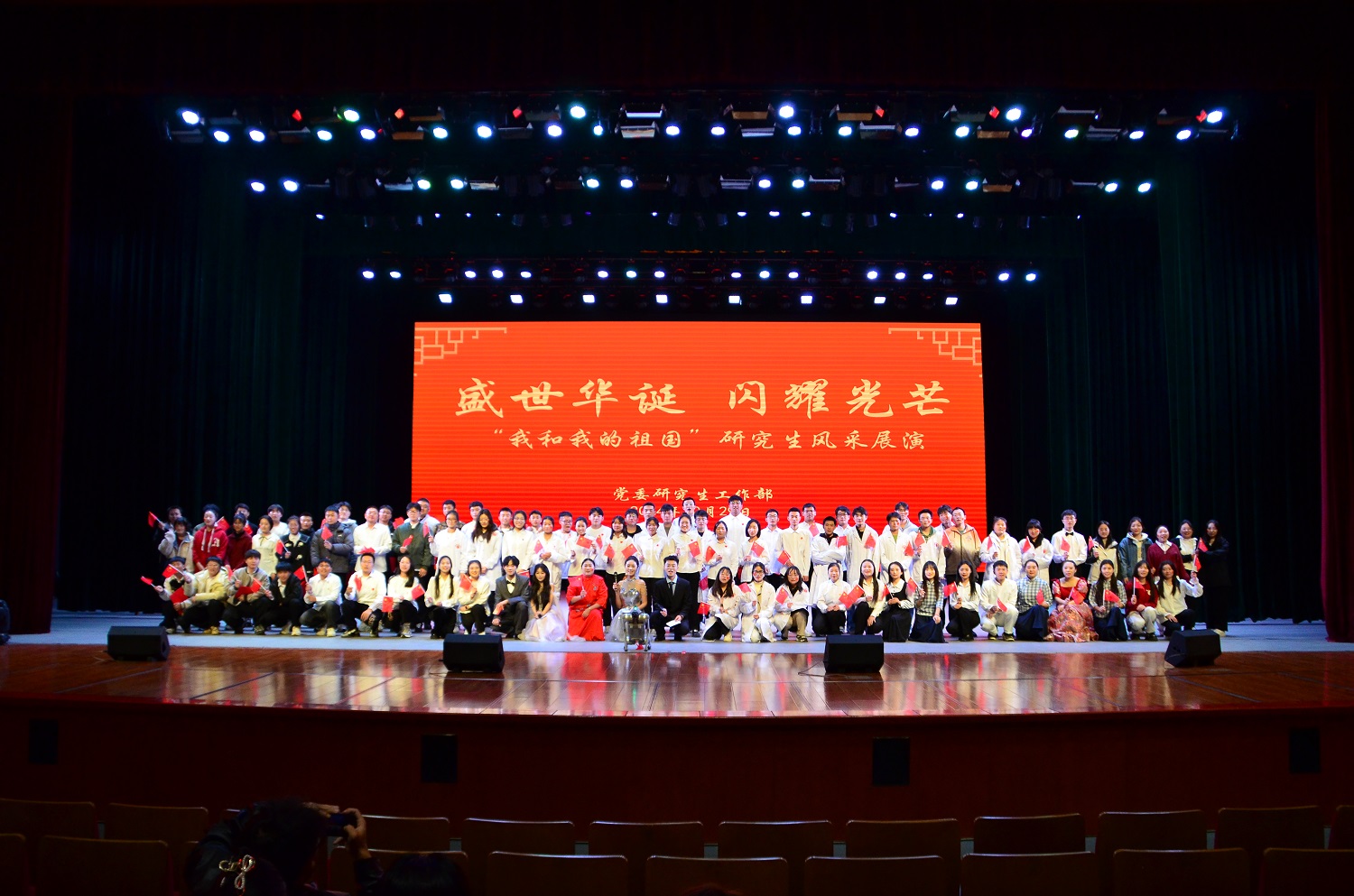 29日晚,本真楼演播厅气氛热烈,座无虚席。来自各个学院以及研究生会的130余名研究生,精心编排并展示了11个节目,以丰富多彩的形式讴歌祖国,表达对党的热爱与崇敬。《大写的中国》《盛世中国》《我骄傲我是中国人》《不朽》等诗歌朗诵节目声情并茂地歌颂祖国的壮丽山河、悠久历史;《歌唱祖国》《强军战歌》等红歌节目旋律铿锵、歌声嘹亮,引发全场观众大合唱;参加舞蹈表演的舞者们用优美的舞姿述说着祖国的繁荣昌盛与祥和安宁。话剧《党旗在心中》传达着信仰和力量,引领同学们听党话、跟党走,为理想而奋斗;竹笛演奏以其独特的魅力让观众沉浸在国风音乐的世界;三句半表演以简洁明快、幽默风趣的风格,赢得观众们的阵阵掌声。