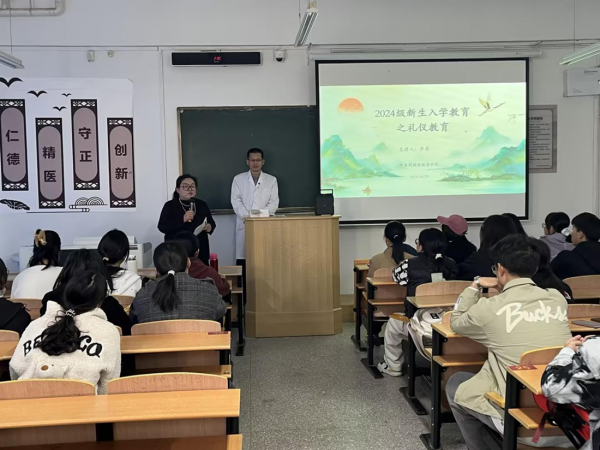 中医药健康服务学院举办2024级新生系列教育——中华礼仪文化专题讲座。此系列讲座共三场,由学院副院长李亮主讲,院团委书记、学工办主任力妙芳主持。