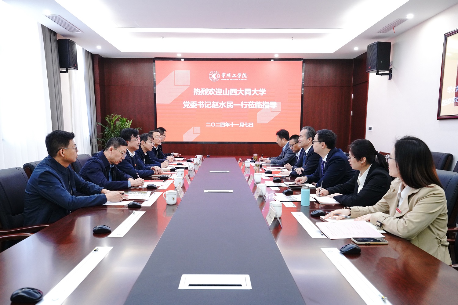 在调研交流中赵水民指出,今年会坚持开放办学,把“大拜访、大交流、大对接”活动作为贯彻落实党的二十届三中全会、全国教育大会精神的重要抓手,持续对表高水平院校、对标同类型标杆院校,深入开展教育思想大讨论,一体推进教学、科技和人才工作,不断深化体制机制改革和制度建设工作,提前谋划“十五五”规划,持续推进学校治理体系和治理能力现代化。赵水民强调,我们要聚焦市校高质量发展需求,聚焦大同,立足山西,面向全国,充分借鉴“大拜访、大交流、大对接”活动学习到的新思想、新思路、新经验、新做法,持续推进“学教研产城”试验区一体化建设,全面实施“百名干部大拜访、百名博士下基层、百名校友回母校、百名专家上讲台、百名校长(厂长)进校园”的“五个一百”工程,在学科、专业、平台、课程内涵建设上出成效、出成果、出特色、出亮点,不断擦亮高水平应用型大学建设的金字招牌。