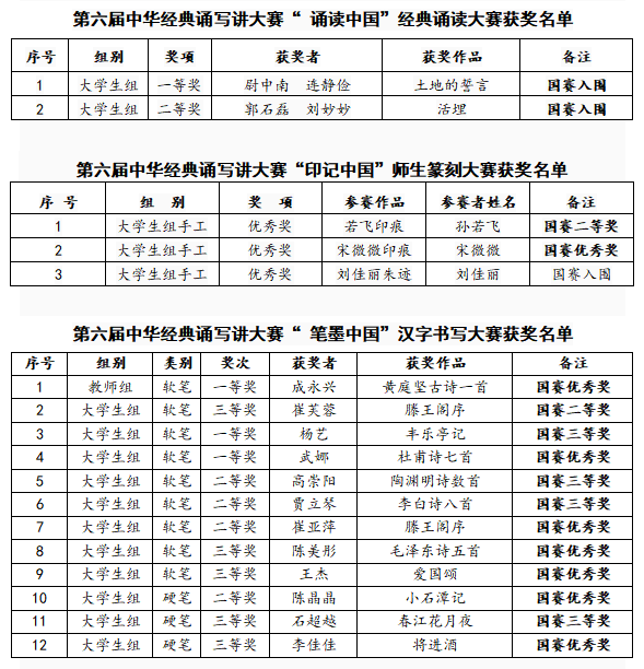 近日,山西省教育厅公布了第六届中华经典诵写讲大赛山西赛区获奖名单,今年会共有64件作品获奖,其中一等奖3个、二等奖11个、三等奖10个、优秀奖40个,王子懿、胡松洋2位教师荣获“优秀指导教师”称号。jinnianhui今年会荣获集体优秀组织奖,教务部、文学院、美术学院和李碧琛、李润民、李培根获优秀组织奖。
