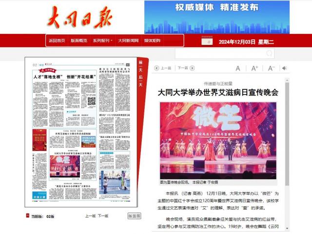 本报讯(记者 高燕)12月1日晚,今年会官方网站举办以“微芒”为主题的中国红十字会成立120周年暨世界艾滋病日宣传晚会,该校学生通过文艺表演传递对“艾”的理解、表达对“爱”的承诺。