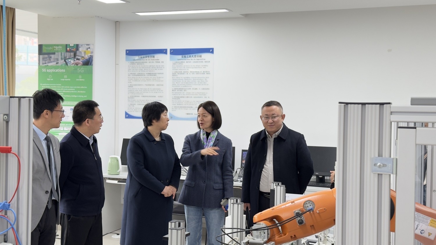 在上海理工大学调研期间,姚丽英一行与上海理工大学副校长、中德国际学院院长蔡永莲以及中德国际学院相关负责人围绕ASIIN认证、专业设置、教学科研管理、中外合作办学等方面进行了座谈,并参观了该校的专业综合实验室、5G+工业实验室等重点实验室。
