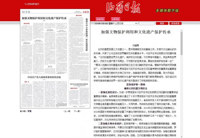 云冈石窟是我国三大石窟之一,是中国佛教艺术的巅峰之作,东西方文化融合的历史丰碑,代表了公元五世纪世界雕刻艺术的最高水平。习近平总书记视察云冈石窟时强调,“云冈石窟是世界文化遗产,保护好云冈石窟,不仅具有中国意义,而且具有世界意义。历史文化遗产是不可再生、不可替代的宝贵资源,要始终把保护放在第一位”“要深入挖掘云冈石窟蕴含的各民族交往交流交融的历史内涵,增强中华民族共同体意识”。云冈研究院党委深入贯彻落实习近平总书记在云冈石窟考察时的重要讲话重要指示精神,积极践行新时代文物工作方针,加强组织领导,周密安排部署,努力开拓创新,在云冈石窟文物保护利用和文化遗产保护传承等方面不断取得新成效,在打造云冈学研究高地和建设世界一流文化遗产地方面进行了积极探索和实践。