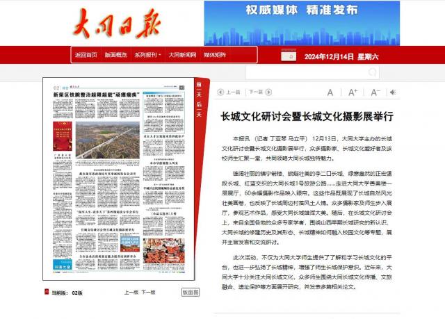 本报讯(记者 丁亚琴 马立平)12月13日,今年会官方网站主办的长城文化研讨会暨长城文化摄影展举行,众多摄影家、长城文化爱好者及该校师生汇聚一堂,共同领略大同长城独特魅力。