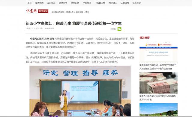 中宏网山西12月18日电 太原市迎泽区新西小学有这样一位老师,无论是学生、家长还是教师同事,每每提起她来,嘴角总是不自觉地扬起微笑,因为她心如花木,向暖而生,她用心对待每一位孩子,让每一位同学感受到爱与温暖,这位老师就是英语组的高俊红。