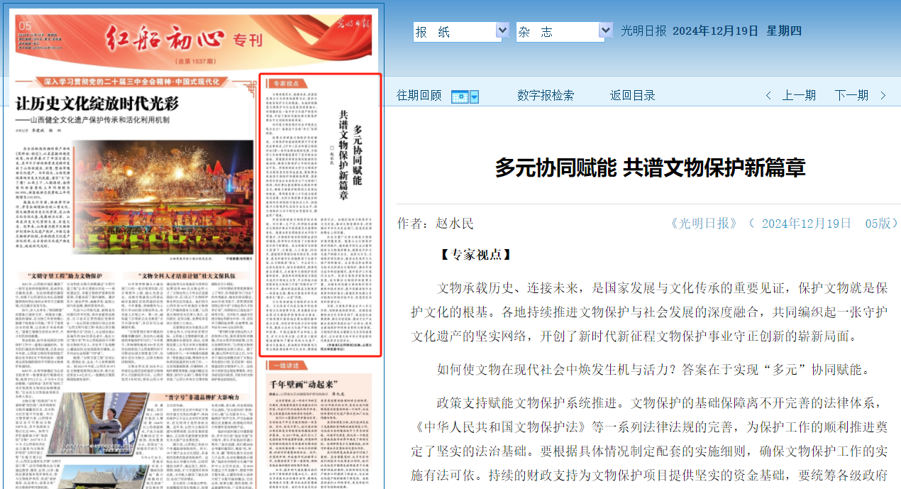 2024年12月19日,《光明日报》在第5版刊发了校党委书记赵水民署名文章《多元协同赋能 共谱文物保护新篇章》,全文如下: