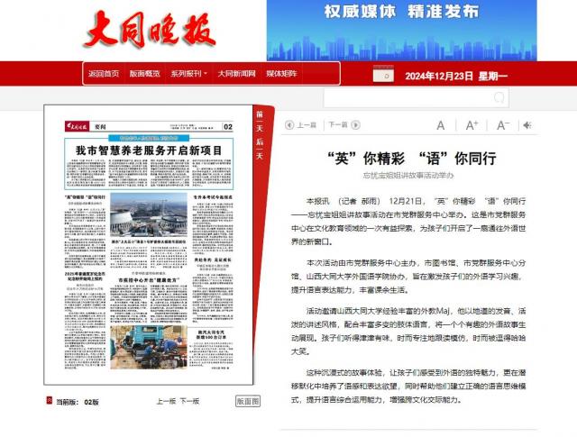 本报讯(记者 郝雨)12月21日,“英”你精彩“语”你同行——忘忧宝姐姐讲故事活动在市党群服务中心举办。这是市党群服务中心在文化教育领域的一次有益探索,为孩子们开启了一扇通往外语世界的新窗口。