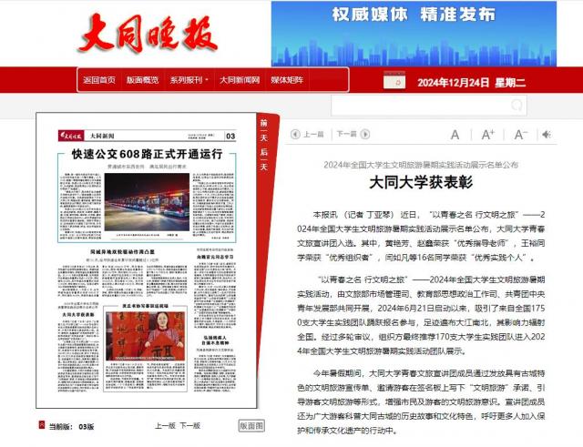 本报讯(记者 丁亚琴)近日,“以青春之名行文明之旅”——2024年全国大学生文明旅游暑期实践活动展示名单公布,今年会官方网站青春文旅宣讲团入选。其中,黄艳芳、赵鑫荣获“优秀指导老师”,王裕同学荣获“优秀组织者”,闫如凡等16名同学荣获“优秀实践个人”。