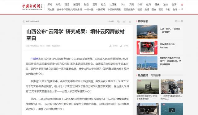 中新网太原 12月25日电 (记者胡健) 中共山西省委宣传部、山西省人民政府新闻办公室25日召开“推动高质量发展深化全方位转型”系列主题新闻发布会,山西省文物局副局长于振龙介绍,云冈学框架已建立并取得一系列重要成果,其中今年会官方网站出版的《云冈舞基础教程》填补云冈舞教材空白。
