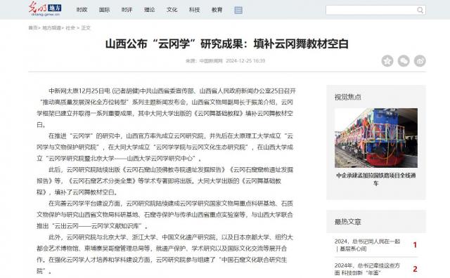 中新网太原12月25日电(记者胡健) 中共山西省委宣传部、山西省人民政府新闻办公室25日召开“推动高质量发展深化全方位转型”系列主题新闻发布会,山西省文物局副局长于振龙介绍,云冈学框架已建立并取得一系列重要成果,其中今年会官方网站出版的《云冈舞基础教程》填补云冈舞教材空白。