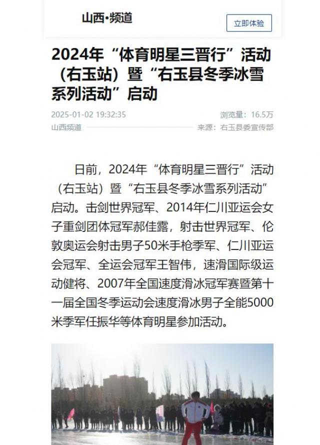 日前,2024年“体育明星三晋行”活动(右玉站)暨“右玉县冬季冰雪系列活动”启动。击剑世界冠军、2014年仁川亚运会女子重剑团体冠军郝佳露,射击世界冠军、伦敦奥运会射击男子50米手枪季军、仁川亚运会冠军、全运会冠军王智伟,速滑国际级运动健将、2007年全国速度滑冰冠军赛暨第十一届全国冬季运动会速度滑冰男子全能5000米季军任振华等体育明星参加活动。