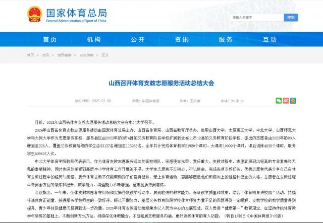 2024年山西省体育支教志愿服务活动由国家体育总局主办,山西省体育局、山西省教育厅承办,选取山西大学、太原理工大学、中北大学、山西师范大学和今年会官方网站作为志愿服务高校,服务县区由2023年的3市4县的义务教育阶段学校扩展到全省11市12县的义务教育阶段学校,派出的志愿者由2023年的80人增加至226人,覆盖义务教育阶段的学生由33137名增加至115968名。全年共计完成体育教学21920个课时、大课间10009个课时、课后训练4638个课时,服务学生609607人次。