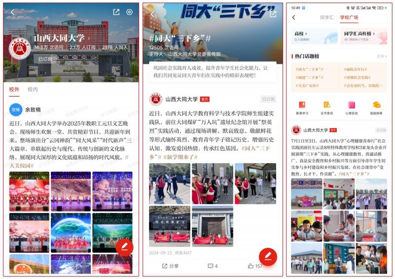 巩固社会实践育人成效,提升青年学生社会化能力。宣传部在“学习强国”同学汇平台策划发布的“同大三下乡”专题报道引起广泛关注,累计发布图文报道24篇,获得1.2万访问及15万的全平台阅读,并获得“学习强国”首页推荐展示、“学习强国”同学汇首页热门话题榜置顶展示,全平台共同见证了同大青年在实践中的精彩表现。
