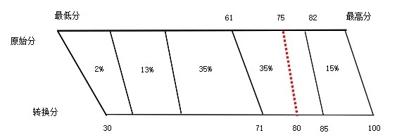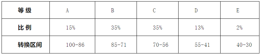 第二步,将A至E五个等级内的考生原始分,按照等比例转换规则,转换到100~86,85~71,70~56,55~41和40~30五个分数区间,根据转换公式计算,四舍五入取整数得到考生的等级转换分。转换后的成绩一分一档,考生排序不变。