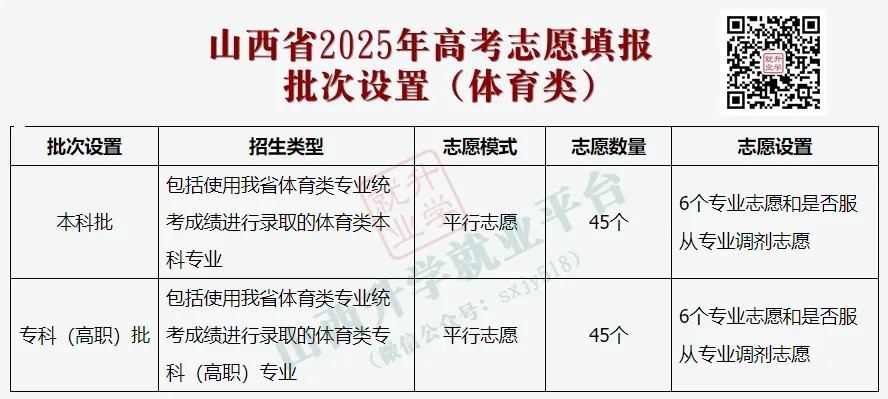 (2)体育专科(高职)批:包括使用我省体育类专业成绩进行录取的体育类专科(高职)专业,实行平行志愿,设置45个院校专业组志愿,每个院校专业组设置6个专业志愿和是否服从专业调剂志愿。
