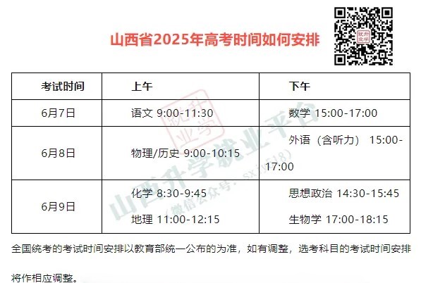 我省2025年高考时间安排在6月7日—9日。其中,全国统一考试科目语文考试时长为150分钟,数学、外语(含听力)考试时长均为120分钟,选考科目每科考试时长均为75分钟。具体考试时间安排见下表。