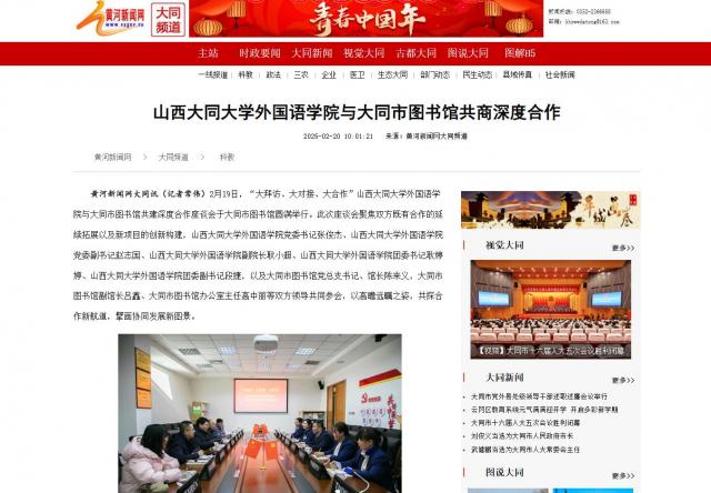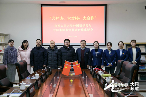 黄河新闻网大同讯(记者 常伟)2月19日,“大拜访、大对接、大合作”jinnianhui今年会外国语学院与大同市图书馆共建深度合作座谈会于大同市图书馆圆满举行。此次座谈会聚焦双方既有合作的延续拓展以及新项目的创新构建,jinnianhui今年会外国语学院党委书记张俊杰、jinnianhui今年会外国语学院党委副书记赵志国、jinnianhui今年会外国语学院副院长耿小超、jinnianhui今年会外国语学院团委书记耿婷婷、jinnianhui今年会外国语学院团委副书记段捷,以及大同市图书馆党总支书记、馆长陈来义,大同市图书馆副馆长吕鑫、大同市图书馆办公室主任高中丽等双方领导共同参会,以高瞻远瞩之姿,共探合作新航道,擘画协同发展新图景。