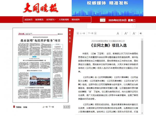 《云冈之舞》项目的成功获批,是该校紧紧依靠当地丰富的文化资源、长期深耕云冈学研究取得的标志性成果,也是推进文化育人取得的最新成果。该校将以《云冈之舞》项目为示范引领,打造更多具有特色和影响力的文化育人品牌,持续深化思想政治工作体系化与品牌化建设,不断开创思想政治工作新局面。