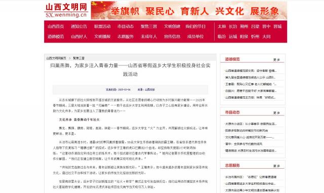这是山西省共青团构建 “引才育才用才留才”全链条机制的生动缩影。2025年寒假,团省委结合团中央“共青团促进大学生就业行动”和全省实习实训工作部署安排,聚焦“青春为中国式现代化挺膺担当”主题,立足主责主业,突出实践育人,累计动员14934名大学生参与“青春兴晋”大学生“返家乡”社会实践,引导广大青年学子扎根三晋大地,在投身基层建设、服务家乡发展中坚定信念、增长本领、作出贡献。