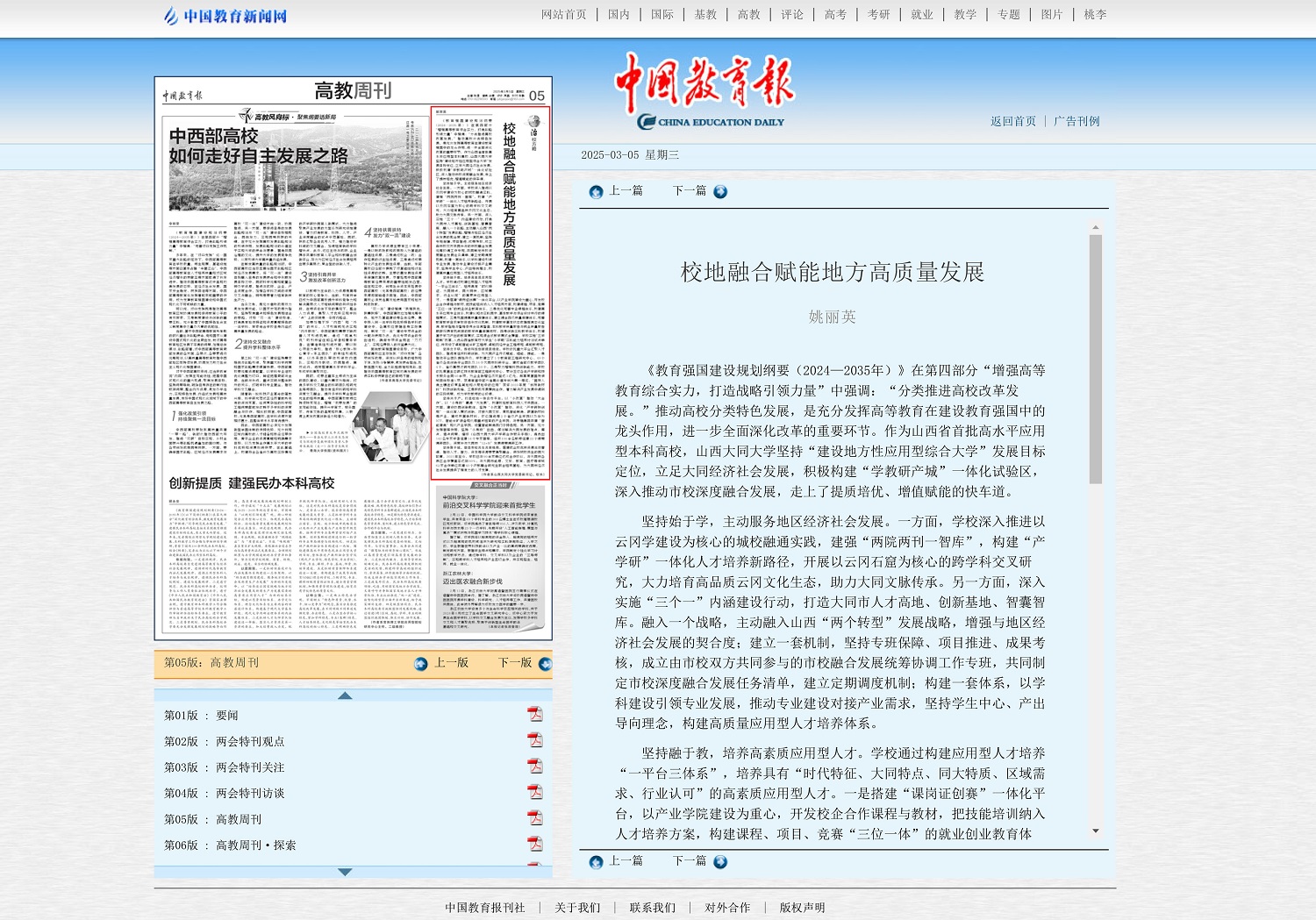 2025年3月5日,《中国教育报》在第5版刊发了校党委副书记、校长姚丽英署名文章《校地融合赋能地方高质量发展》,全文如下: