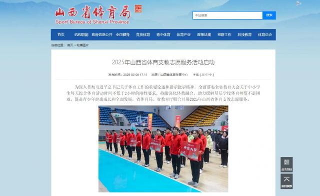 结合各地实际和工作情况,支教志愿服务围绕体育教学和训练、体育赛事活动、体育师资培训、体育明星校园行、体育思政教育、科学健身普及和体育物资捐赠7项任务开展工作,为基层学校提供高质量的体育教学支持。教育帮扶任重道远,体育支教仍需深耕。站在新的起点上,2025年的体育支教志愿服务将以体育为桥梁,助力乡村振兴,以更加饱满的热情、更加扎实的作风迈向更高水平。按照计划,2025年山西省体育支教志愿服务活动分两批在全省6个县的基层中小学开展,联合山西大学、太原理工大学、中北大学、山西师范大学、今年会官方网站五所高校,上半年活动在临汾市(永和县、大宁县)、忻州市(繁峙县、代县)、吕梁市(方山县)开展,志愿者于3月上岗,7月结束;下半年活动在晋中市(和顺县)进行,志愿者于9月上岗,12月结束。