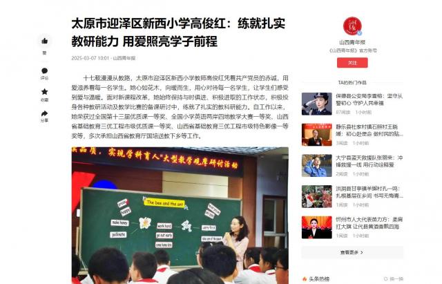 十七载漫漫从教路,太原市迎泽区新西小学教师高俊红凭着共产党员的赤诚,用爱滋养着每一名学生。她心如花木,向暖而生,用心对待每一名学生,让学生们感受到爱与温暖。面对新课程改革,她始终保持与时俱进、积极进取的工作状态,积极投身各种教研活动及教学比赛的备课研讨中,练就了扎实的教科研能力。自工作以来,她荣获过全国第十三届优质课一等奖、全国小学英语两岸四地教学大赛一等奖、山西省基础教育三优工程市级优质课一等奖、山西省基础教育三优工程市级特色影像一等奖等,多次承担山西省教育厅国培送教下乡等工作。