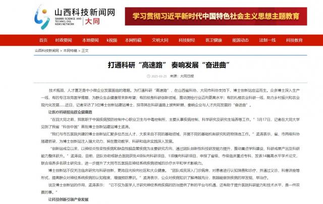 “创新站成立以来,以神经炎性变性疾病和缺血性脑血管疾病为主要研究方向,通过团队创新性科技研发能力提升,推动重点学科建设、科研成果产出及科研能力整体跃升。”孟涛说,目前,团队协助或联合医院获批4项纵向科研项目、1项横向科研项目,申报了省级、市级临床重点专科,发表14篇高水平学术论文,联合培养多名硕士研究生,进一步提升了大同市五医院在神经系统疾病领域的诊疗水平和学术影响力。