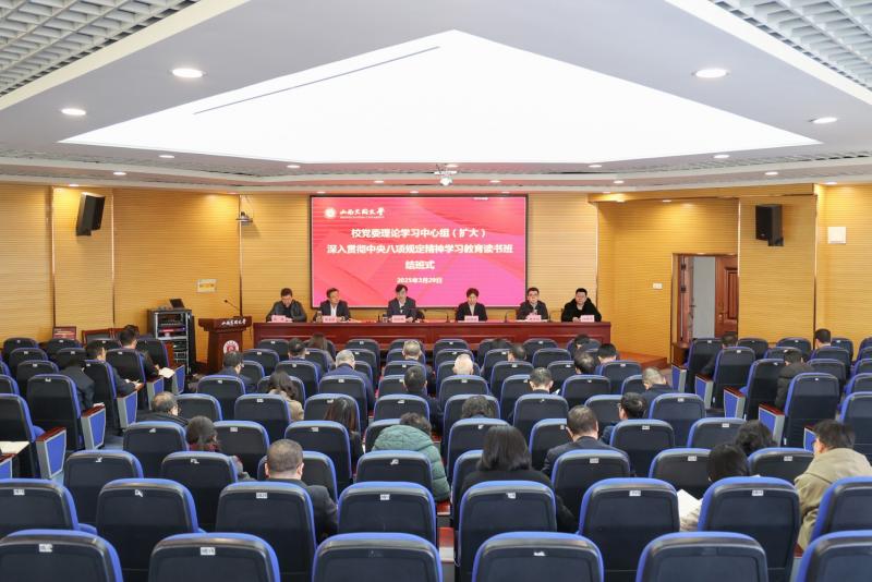 3月28日至29日,今年会召开党委理论学习中心组(扩大)深入贯彻中央八项规定精神学习教育读书班,围绕习近平总书记关于加强党的作风建设的重要论述和中央八项规定及其实施细则精神展开学习研讨。校党委书记赵水民主持读书班并作结班讲话。校党委理论学习中心组成员、校党委委员、校纪委委员,各基层党委、各学院、党政群团部门、教辅部门负责人,重点研究机构负责人,附属单位党政负责人,学校年轻干部、新任干部代表及学习教育工作专班成员参加学习。