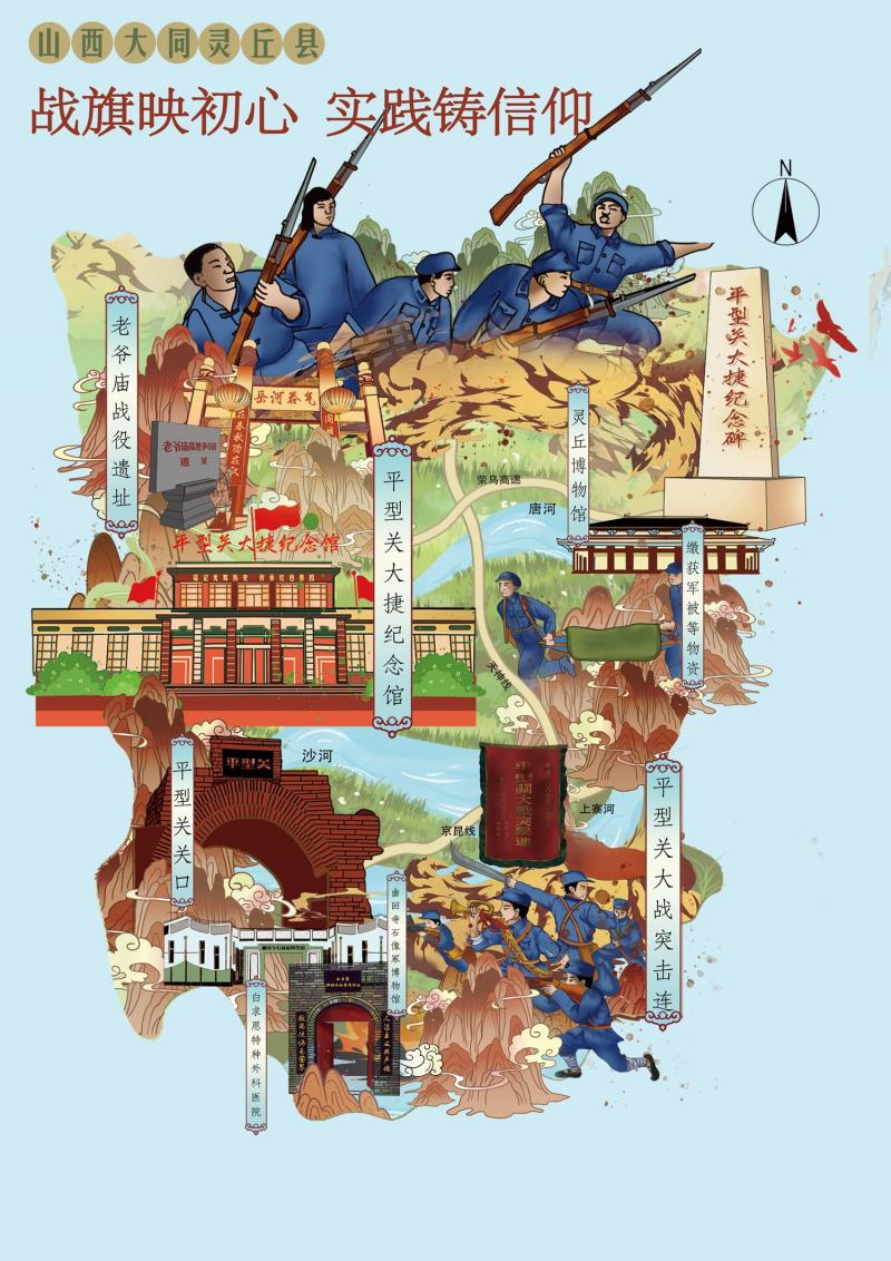 张俊团队多次赴我省“大思政课”实践教学基地——平型关大捷纪念馆参观学习、深入调研,反复推敲相关材料,最终打磨出《“战旗映初心 实践铸信仰”手绘地图》。手绘地图通过8个场景描绘了党领导下的人民军队获得抗日战争首次胜利的来之不易,展现出扎实的专业素养和创新的设计思维。