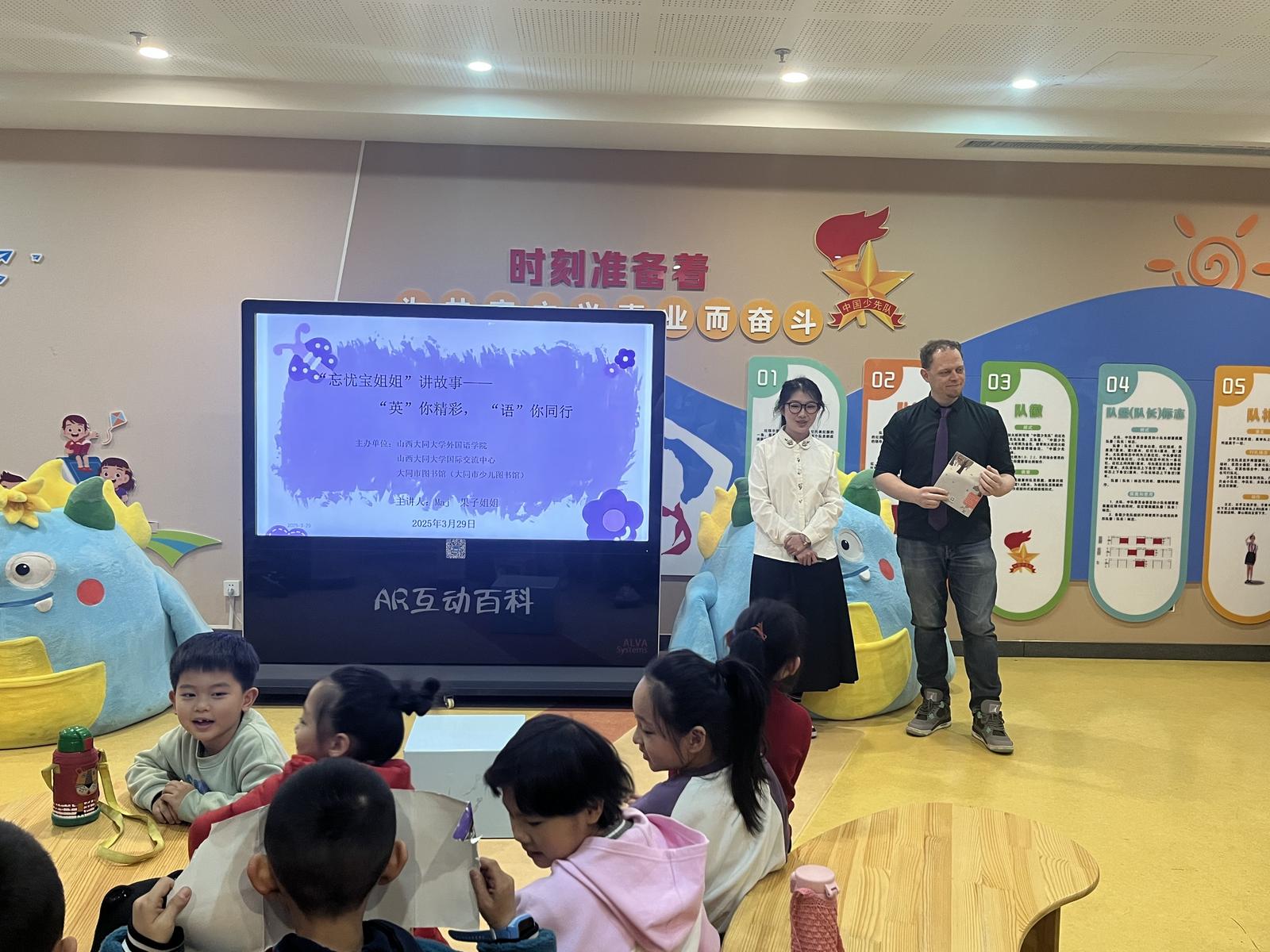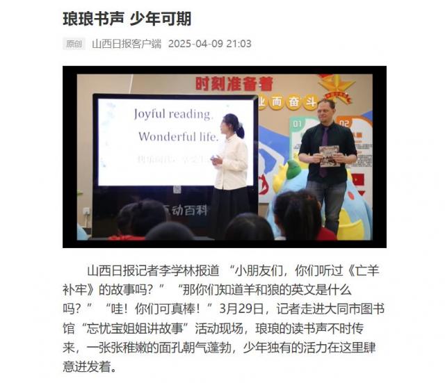 山西日报记者 李学林报道 “小朋友们,你们听过《亡羊补牢》的故事吗?”“那你们知道羊和狼的英文是什么吗?”“哇!你们可真棒!”3月29日,记者走进大同市图书馆“忘忧宝姐姐讲故事”活动现场,琅琅的读书声不时传来,一张张稚嫩的面孔朝气蓬勃,少年独有的活力在这里肆意迸发着。
