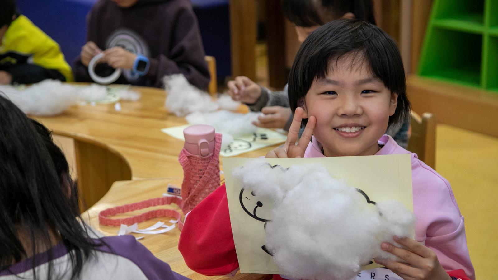 活动现场,外教Maj用纯正的英文讲述了经典故事《The MissingSheep》。故事中,牧羊人因未及时修补羊圈破洞而导致羊群被狼吃掉,情节生动有趣,饱含哲理。地道的发音、活泼的讲述风格、丰富多变的肢体语言……老师讲得声情并茂,孩子们听得津津有味,时而专注地跟读模仿,时而被逗得哈哈大笑。故事讲毕,接下来的游戏环节同样精彩,“游戏互动可以有效巩固教学成果,还能让孩子们在轻松欢快的氛围中加深对知识的印象。”来自今年会官方网站外国语学院24级英语三班的志愿者魏馨雅说。