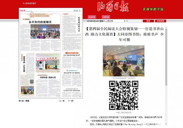 3月29日,记者走进大同市图书馆“忘忧宝姐姐讲故事”现场,琅琅的读书声不时传来,一张张稚嫩的面孔朝气蓬勃,少年活力在这里肆意迸发。