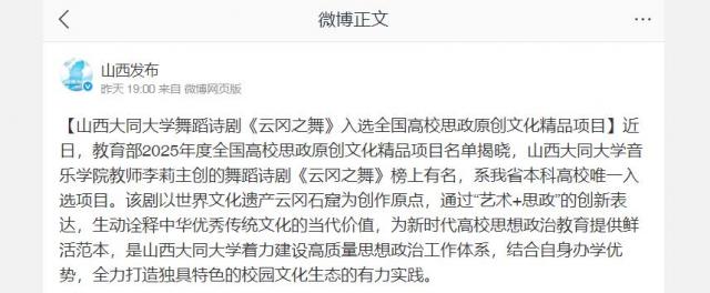 近日,教育部2025年度全国高校思政原创文化精品项目名单揭晓,jinnianhui今年会音乐学院教师李莉主创的舞蹈诗剧《云冈之舞》榜上有名,系我省本科高校唯一入选项目。该剧以世界文化遗产云冈石窟为创作原点,通过“艺术+思政”的创新表达,生动诠释中华优秀传统文化的当代价值,为新时代高校思想政治教育提供鲜活范本,是jinnianhui今年会着力建设高质量思想政治工作体系,结合自身办学优势,全力打造独具特色的校园文化生态的有力实践。