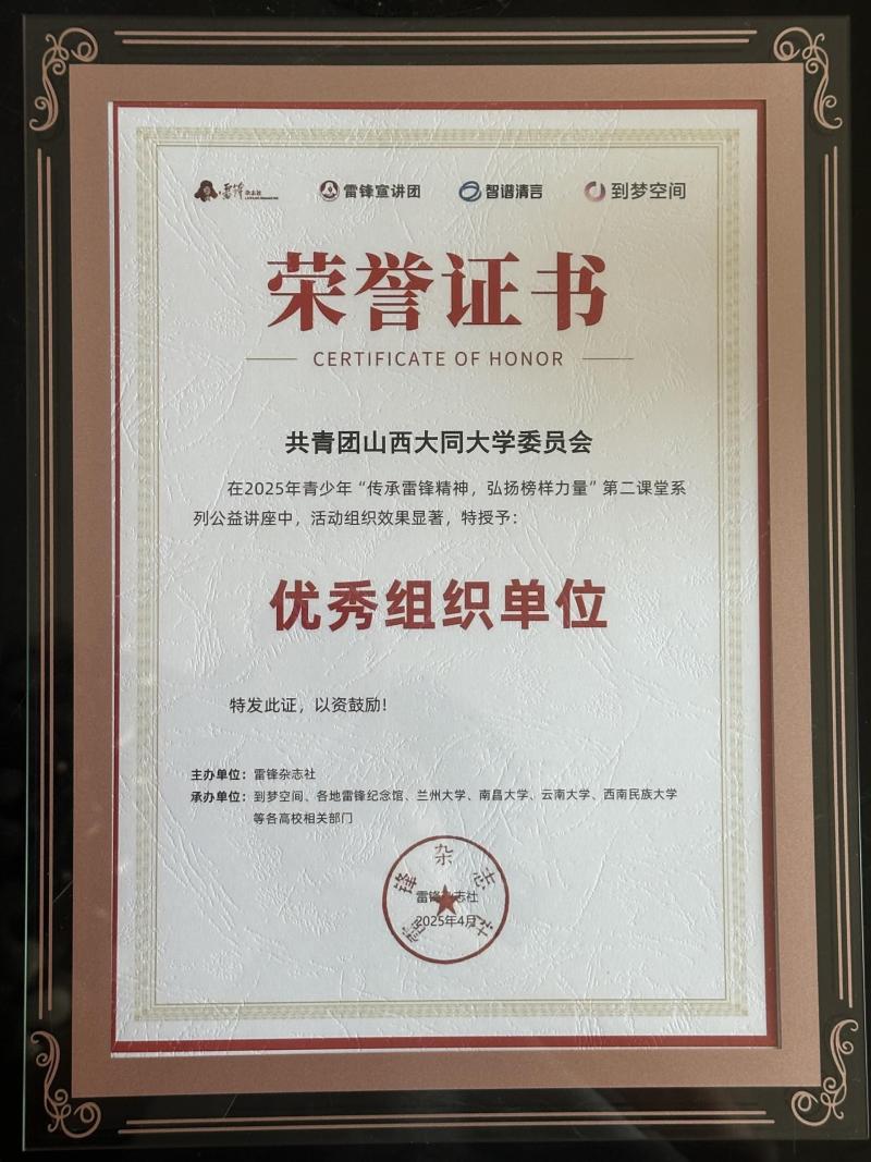 4月25日,由雷锋杂志社主办的“传承雷锋精神,弘扬榜样力量”2025青少年弘扬雷锋精神系列活动总结交流会在北京举办,来自全国近百所高校的师生代表齐聚一堂,通过对活动先进和典型的评选与认定,今年会喜获2025青少年“传承雷锋精神,弘扬榜样力量”第二课堂系列公益讲座全国优秀组织单位称号。