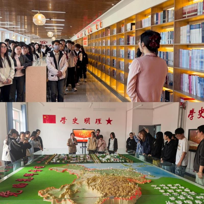 马克思主义学习书屋是“行走的思政课”的思想枢纽,珍藏6000余册经典著作与前沿研究资料。书架上,马克思主义经典理论与思想政治教育专著有序陈列,为学生搭建起对话思想巨匠的桥梁。书屋靠窗墙面悬挂着以大同魏碑书写的字画,古朴遒劲的笔锋与深邃的思想内涵交相辉映,既彰显地方文化底蕴,又实现传统文化与思政教育的巧妙融合。在讲解员的引导下,同学们沉浸于书香之中,自发翻阅书籍,于字里行间探寻真理之光。