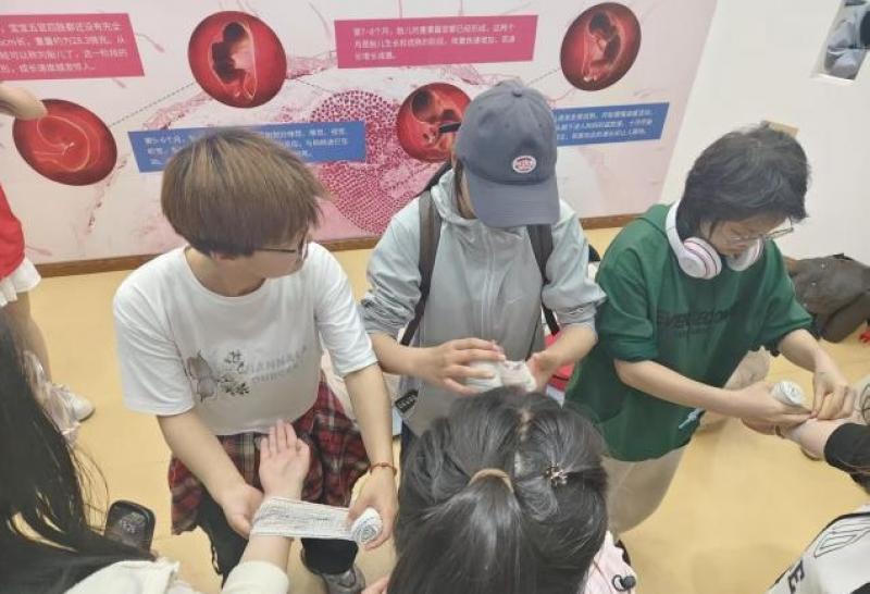 师生们走进医学院人体生命科学馆,开展跨学科实践学习。心肺复苏(CPR)实践互动和急救包扎实操演示,让同学们在沉浸式体验中关注健康防护和快速掌握急救技能,深刻感悟生命的神圣与医学的严谨,增强敬畏生命、尊重科学、服务社会的意识。