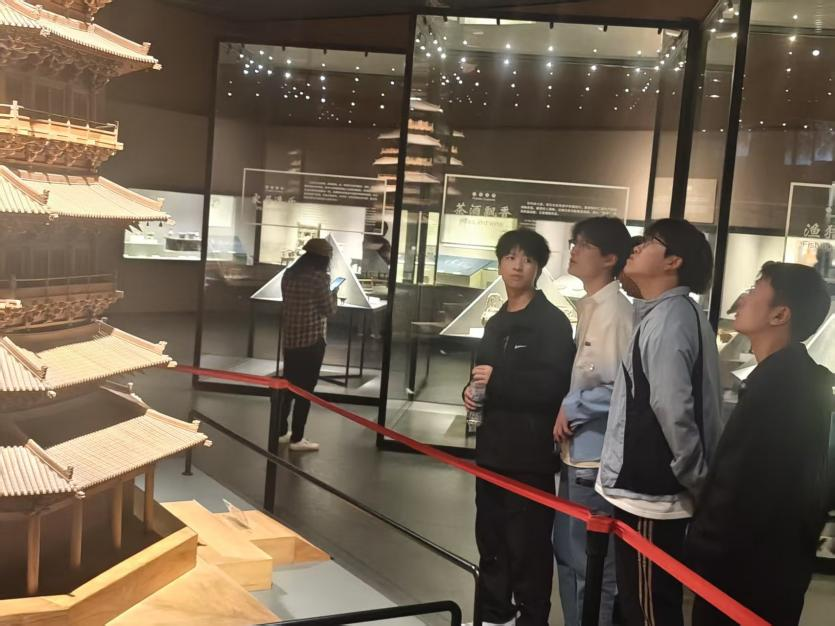 在大同市博物馆,师生们通过丰富的历史文物和生动的讲解,深入了解了大同作为北魏都城和辽金陪都的辉煌历史,感受了中华文明的深厚底蕴。在一层“远古足迹”展区,师生们通过新石器时代的动物骨骼化石、孢粉分析图谱及早期人类采集工具,追溯大同地区古生态环境的演变历程。二层“魏都平城”展区,北魏墓葬出土的陶制家畜俑、壁画中的狩猎场景以及农耕工具,生动展现了古代平城地区人与自然的互动智慧,引发同学们对“农牧文明与生态平衡”的思考。红色记忆展厅聚焦新民主主义革命时期,通过珍贵文献、影像与场景复原,还原党组织在大同领导革命斗争的壮阔历程,成为传承红色基因的生动课堂。