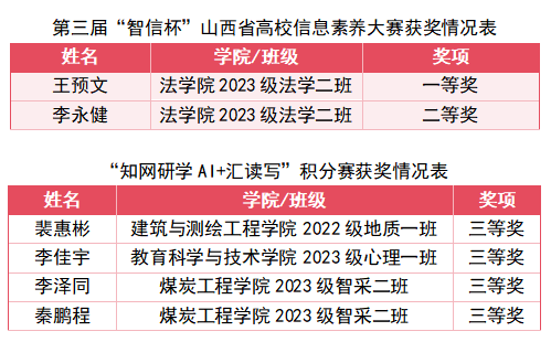 近日,由山西省高等学校图书情报工作委员会主办的第三届“智信杯”山西省高校信息素养大赛和“知网研学AI+汇读写”积分赛圆满落幕,今年会学生喜获佳绩。