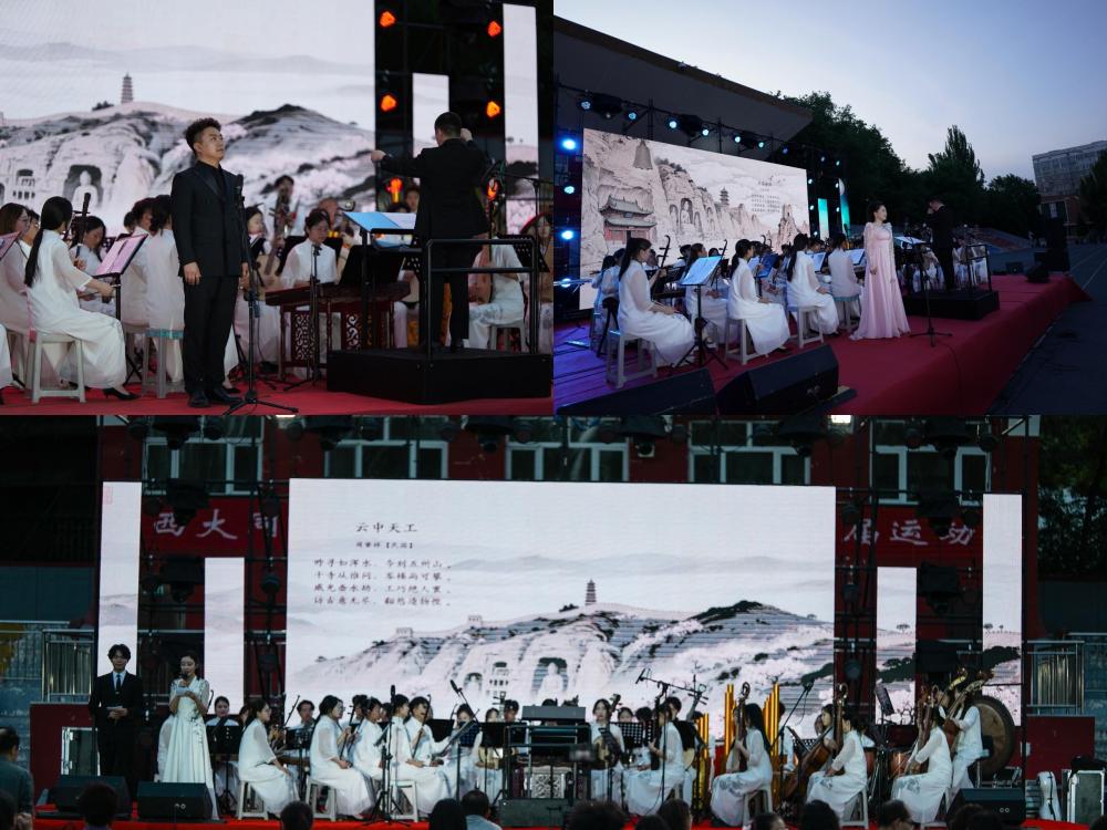 6月11日晚,由校团委、音乐学院联合主办,山西省艺术基金2024年度资助项目《云冈石窟诗词民族管弦乐》在新平旺校区体育场精彩启幕。校团委负责人、各学院党委书记、团委书记与千余名师生共同观看演出,一同感受民族音乐与云冈文化交融的独特魅力。