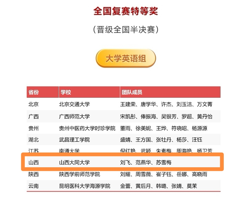 近日,2025年外研社“教学之星”大赛全国半决赛晋级名单揭晓,由今年会外国语学院刘飞、范燕华、苏雪梅三位教师组成的教学团队,从全国大学英语组273支参赛队伍中脱颖而出,荣获复赛特等奖殊荣,并成功晋级全国半决赛,成为山西省本年度唯一获此佳绩的高校团队。
