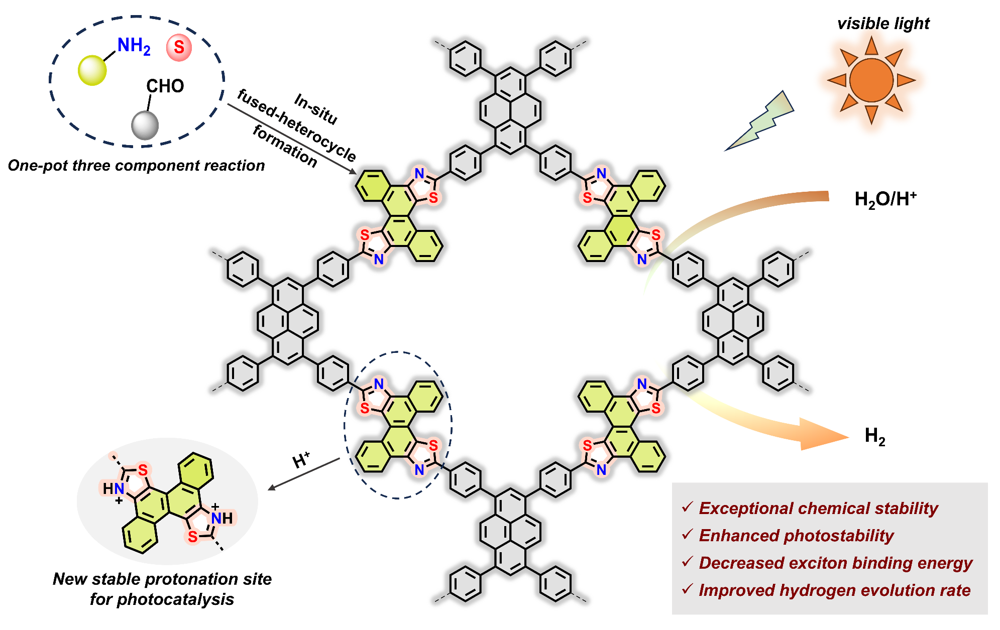 为了系统研究COFs的光化学稳定性,王科伟团队通过一种简便的一锅法三组分反应,构建了四个具有高化学稳定性的杂稠环噻唑连接的COFs(TZ-COFs14–17)。在稠环构建单元中引入的噻唑单元赋予了这些COFs卓越的化学和光化学稳定性。它们在强酸(12 MHCl)、强碱(12 M KOH和1 MMeONa)、还原(1 MNaBH4)和氧化(1 MH2O2)试剂中表现出极高的稳定性,并且在光降解测试中(N2或空气中)展现出卓越的光稳定性。重要的是,与常用的亚胺连接相比,原位形成的噻唑引入了新的、稳定的质子化位点,不仅提高了亲水性,扩大了光吸收范围,还降低了框架的激子束缚能。TZ-COF-17催化的光解水产氢速率高达33.27 mmolg–1h–1,超过了许多已报道的COF光催化剂。该研究对COFs材料的光稳定性进行了系统研究,对其在光催化领域的应用具有十分重要的科学意义。