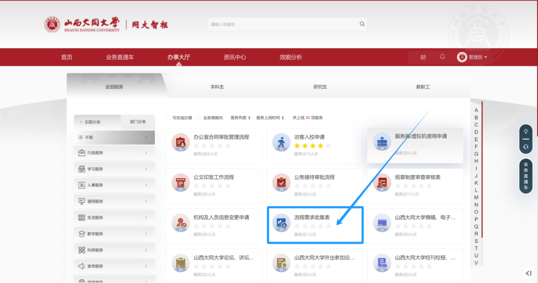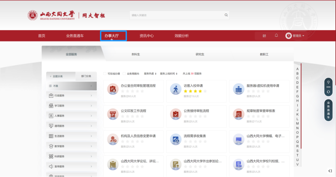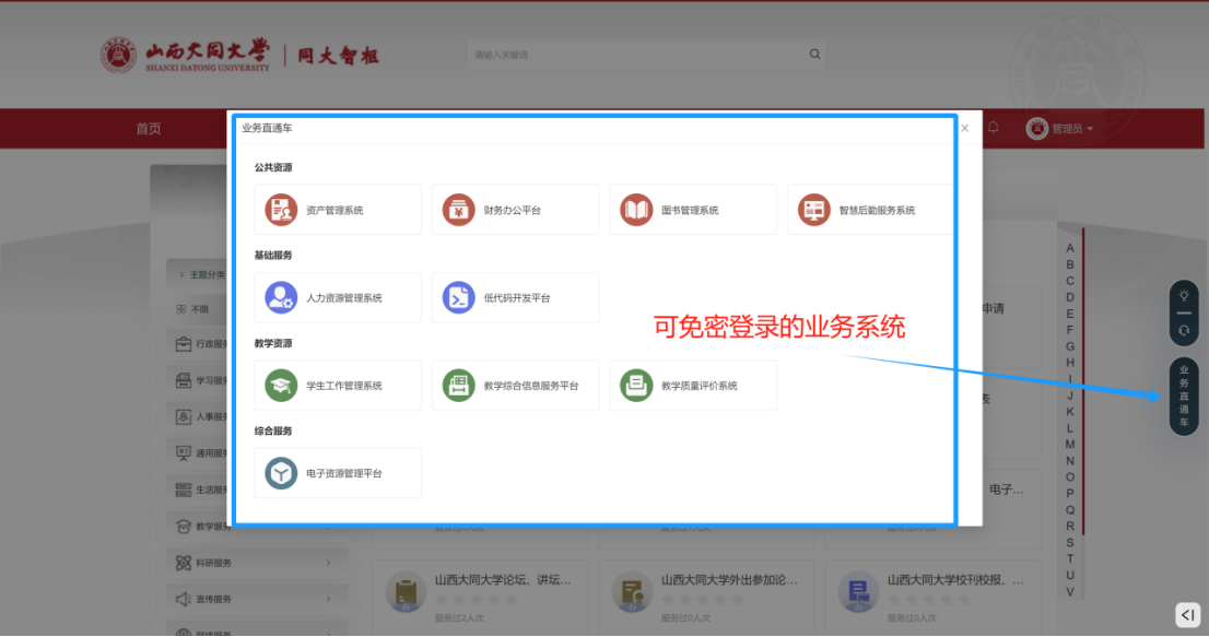 在同大智枢界面中,可选择“办事大厅”进行各职能部门的业务办理,也可点击业务直通车免密进入各业务系统。