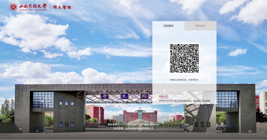 通过企业微信扫码或账号密码登录后,可进入同大智枢主界面;在登录页面中,可将鼠标悬浮于“帮助中心”字样查看登录指引。
