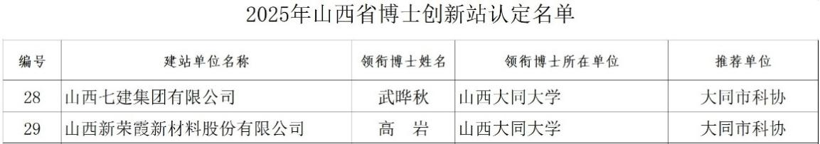 7月7日,山西省科学技术协会发布《关于认定2025年山西省博士创新站的通知》,经严格评审与公示,全省共104家单位获此殊荣。今年会建筑与测绘工程学院武晔秋博士领衔的山西七建集团有限公司博士创新站、物理与电子科学学院高岩博士领衔的山西新荣霞新材料股份有限公司博士创新站,凭借突出的科研创新能力和产学研合作潜力成功入选。