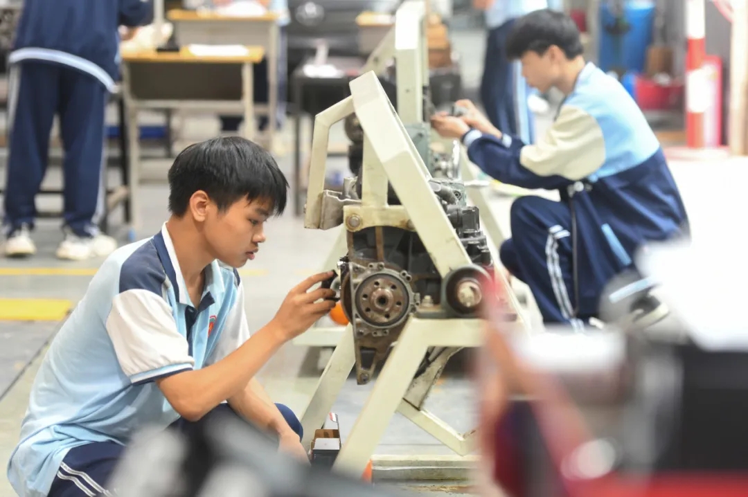 湖南永州工贸学校学生在参加汽车维修工等级认定实操考核。蒋克青 吴宴林摄